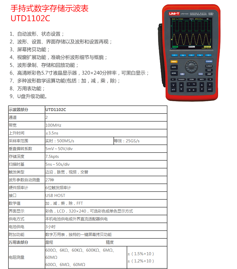 示波器 優(yōu)利德/UNI-T 數字存儲示波器,手持式,UTD1102C