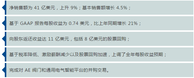 艾默生公布截至2018年12月31日的公司第一季度的財務(wù)業(yè)績(jì)。其中,凈銷(xiāo)售額增長(cháng)9%,基本銷(xiāo)售額增長(cháng)4.5%,貨幣折算帶來(lái)1.5%的消極影響以及業(yè)務(wù)并購帶來(lái)6%的積極影響。