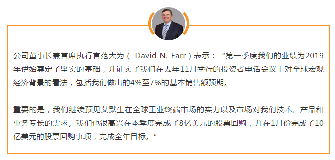 范大為表示:“全年訂單、基本銷(xiāo)售額、盈利能力和現金流均已步入正軌,旨在實(shí)現強勁增長(cháng)的2019財年。在我們的每股收益預期內,我們在運營(yíng)中納入了3美分運營(yíng)上的并購費用,鑒于第一季度表現強于預期,將預期范圍提高了5美分。2019年我們將繼續有所作為,世界各地團隊已準備好為客戶(hù)和股東提供更高價(jià)值?!?/span>
